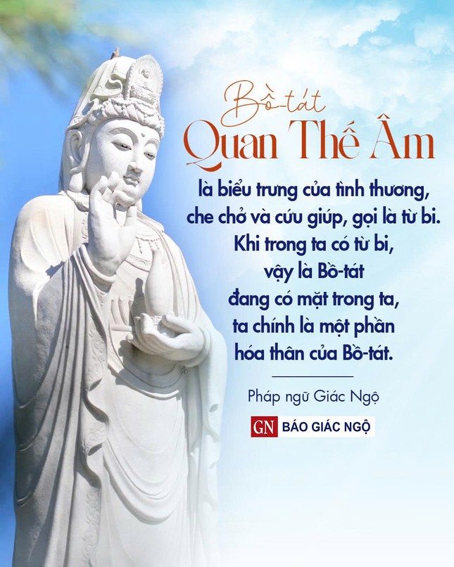 GNO – Bồ-tát Quán Thế Âm là biểu trưng của tình thương, che chở và cứu giúp, gọi là từ bi. Khi trong ta có từ bi, vậy là Bồ-tát đang có mặt trong ta, ta chính là một phần hóa thân của Bồ-tát. Ngài còn biểu trưng cho hạnh lắng nghe. Nghe tiếng đau khổ, lo toan, sợ hãi… của mọi người và mọi loài…